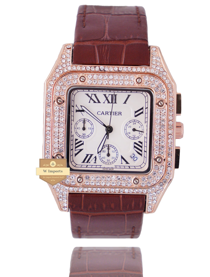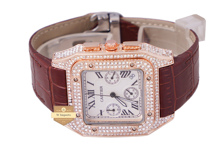 NEW ARRIVAL CHRONOGRAPH COLLECTION STONED CASE ROSE GOLD WITH WHITE DAIL & LEATHER STRAP WATCH