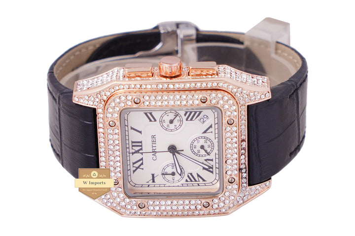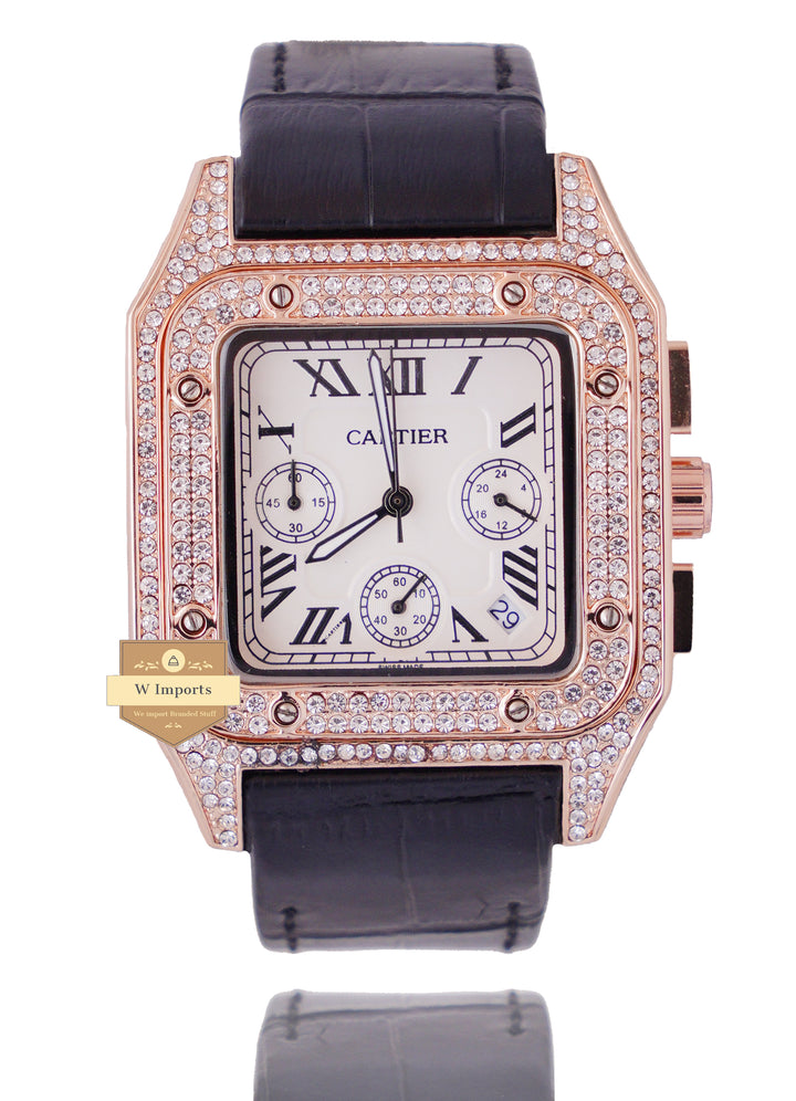 NEW ARRIVAL CHRONOGRAPH COLLECTION STONED CASE ROSE GOLD WITH WHITE DAIL & LEATHER STRAP WATCH