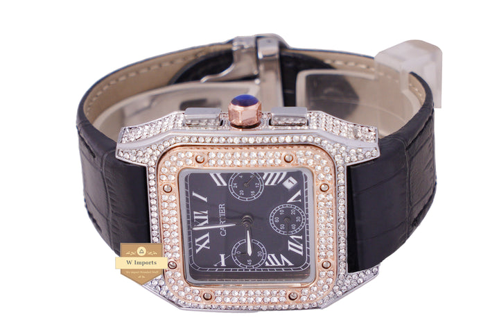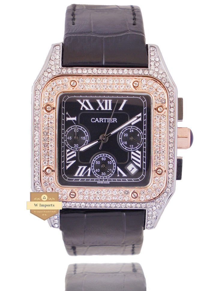 NEW ARRIVAL CHRONOGRAPH COLLECTION STONED CASE TWO TONE ROSE GOLD WITH BLACK DIAL & LEATHER STRAP WATCH