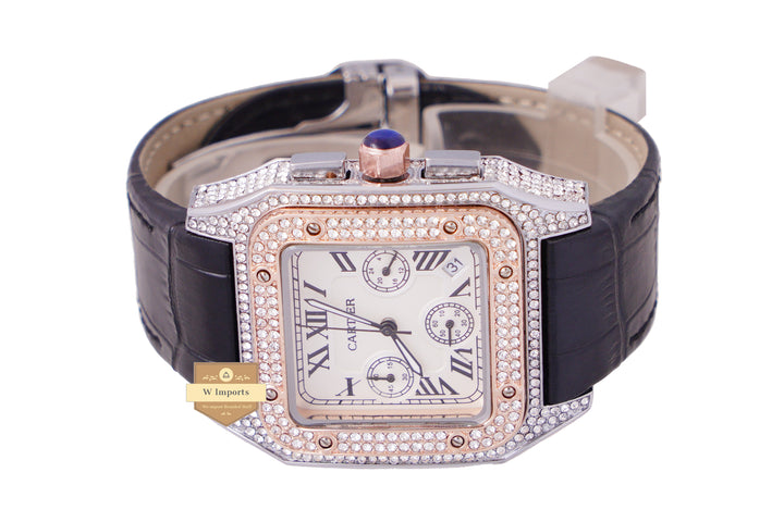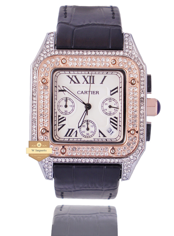 NEW ARRIVAL CHRONOGRAPH COLLECTION STONED CASE TWO TONE ROSE GOLD WITH WHITE DIAL & LEATHER STRAP WATCH
