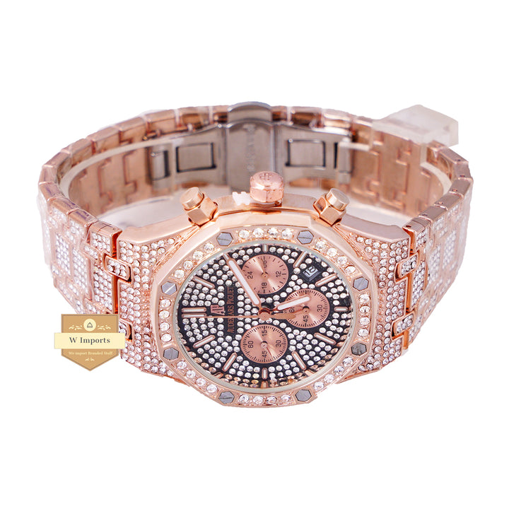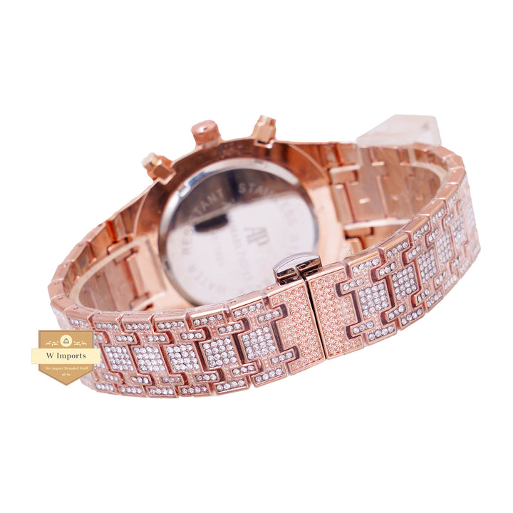 NEW LATEST CHRONOGRAPH COLLECTION ALL ROSE GOLD STONED WITH SILVER STONED DIAL ZARKOON CHAIN WATCH
