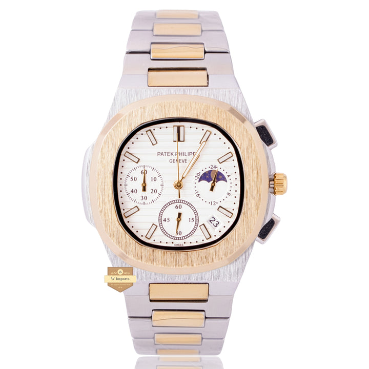 NEW LATEST CHRONOGRAPH COLLECTION TWO TONE YELLOW GOLD WITH WHITE DAIL MOON PHASE CHAIN WATCH