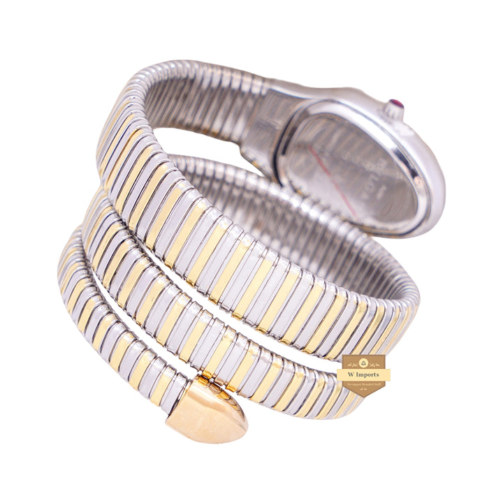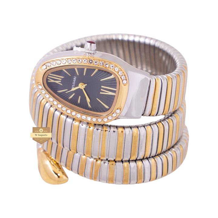 NEW LATEST COLLECTION SNAKE STYLE TWO TONE YELLOW GOLD SILVER WITH BLACK DIAL LADIES CHAIN WATCH