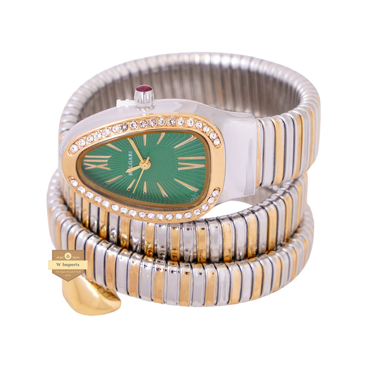 NEW LATEST COLLECTION SNAKE STYLE YELLOW GOLD SILVER WITH GREEN DIAL LADIES CHAIN WATCH