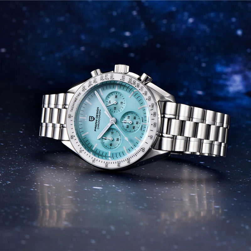 Pagani Design PD-1701 Ice Blue Moonwatch. This men's chronograph watch is an homage to the classic Omega Speedmaster and features a striking ice blue dial with a stainless steel case and bracelet.