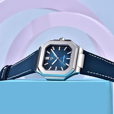 - Design:Β This model has a 37mm case diameter, an ultra-thin profile of around 9.5mm, and an intricately textured blue dial with luminous hands and hour markers. The image shows it on a blue leather or fabric strap, though it is also commonly available with an integrated stainless steel bracelet.