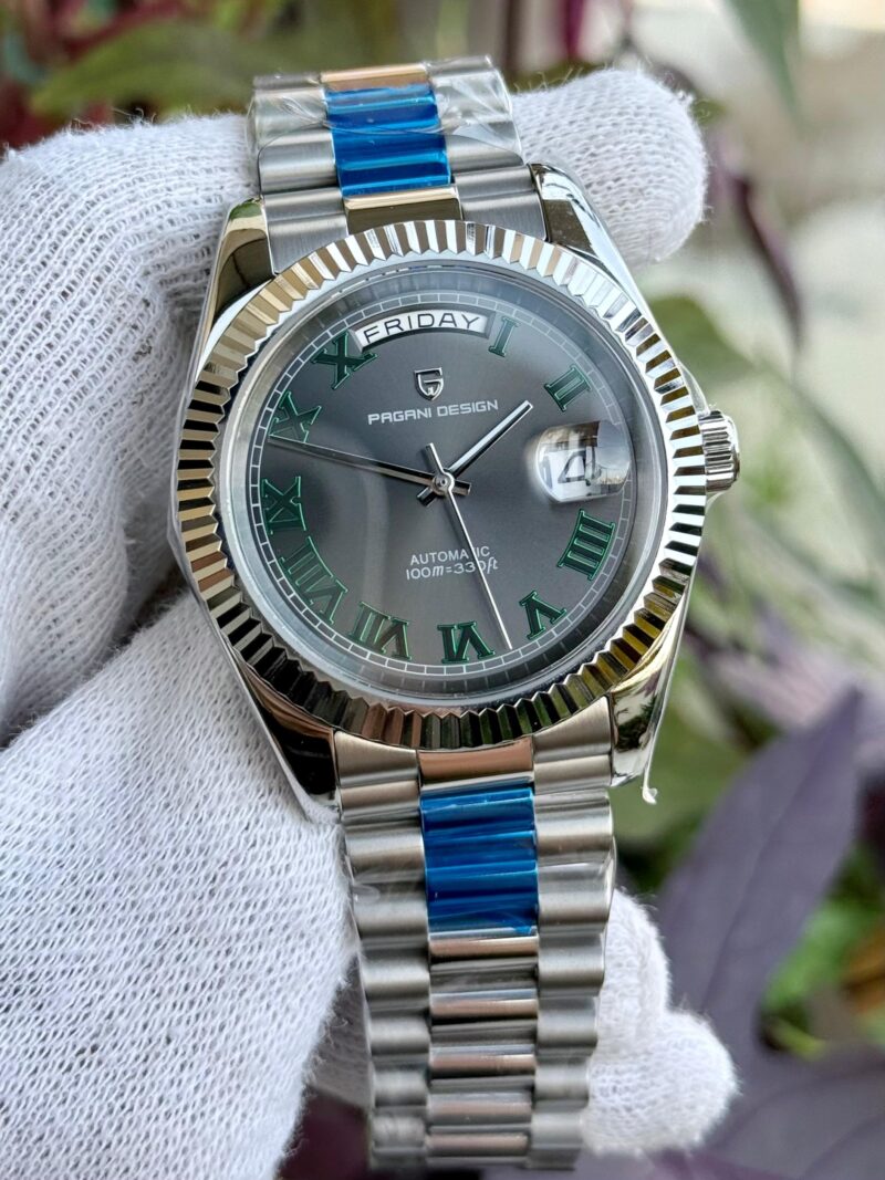 Pagani Design DD40 PD-1783 men's automatic watch, often referred to as the "Wimbledon Edition" due to its grey dial and green Roman numeral hour markers.