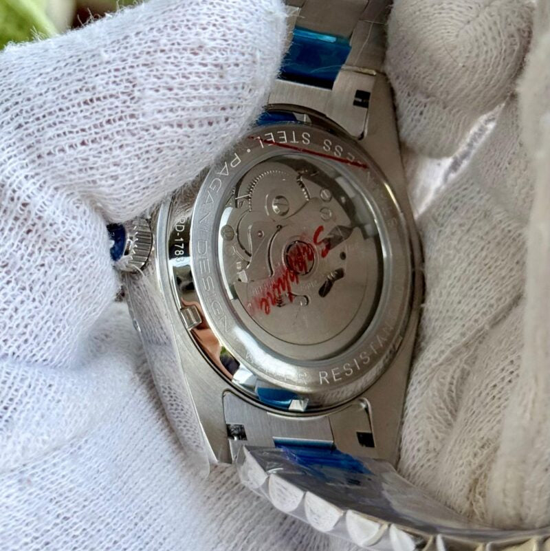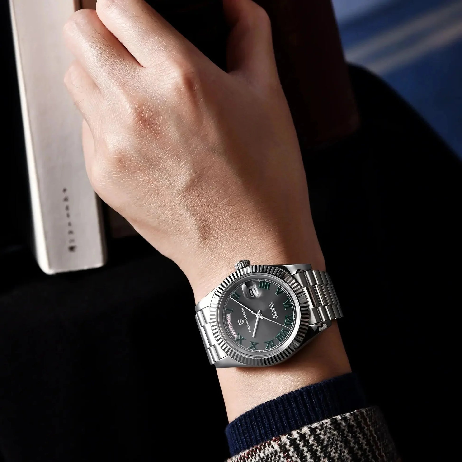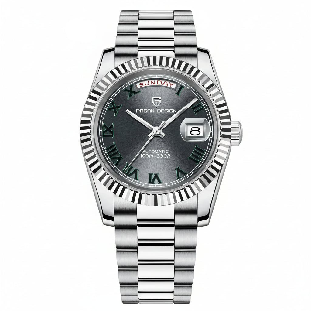 PAGANI DESIGN MEN'S WIMBLEDON DAYNDATE AUTOMATIC SILVER STAINLESS STEEL CARCOAL DAIL CHAIN WATCH SKU-PD1783